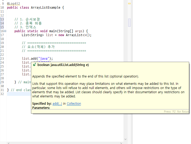list.add("java"); // 컬렉션의 맨 끝에 추가
